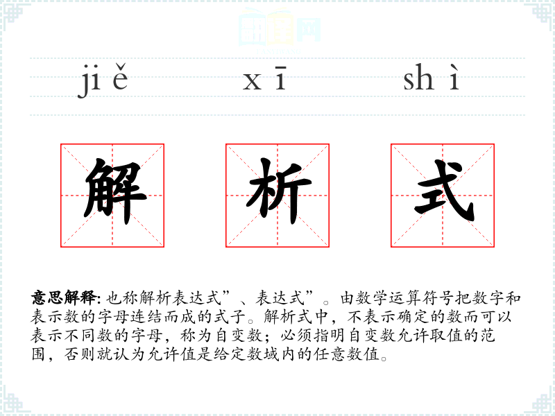 1.也称解析表达式”、表达式”。由数学运算符号把数字和表示数的字母连结而成的式子。解析式中,不表示确定的数而可以表示不同数的字母,称为自变数;必须指明自变数允许取值的范围,否则就认为允许值是给定数域内的任意数值。
