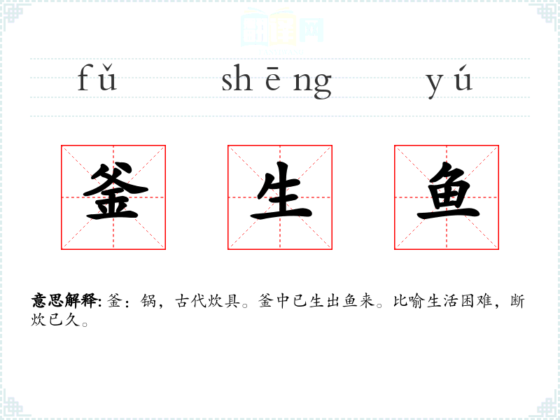 釜:锅,古代炊具。釜中已生出鱼来。比喻生活困难,断炊已久。