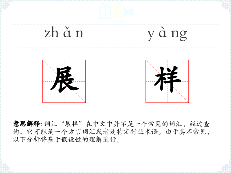 词汇“展样”在中文中并不是一个常见的词汇,经过查询,它可能是一个方言词汇或者是特定行业术语。由于其不常见,以下分析将基于假设性的理解进行。