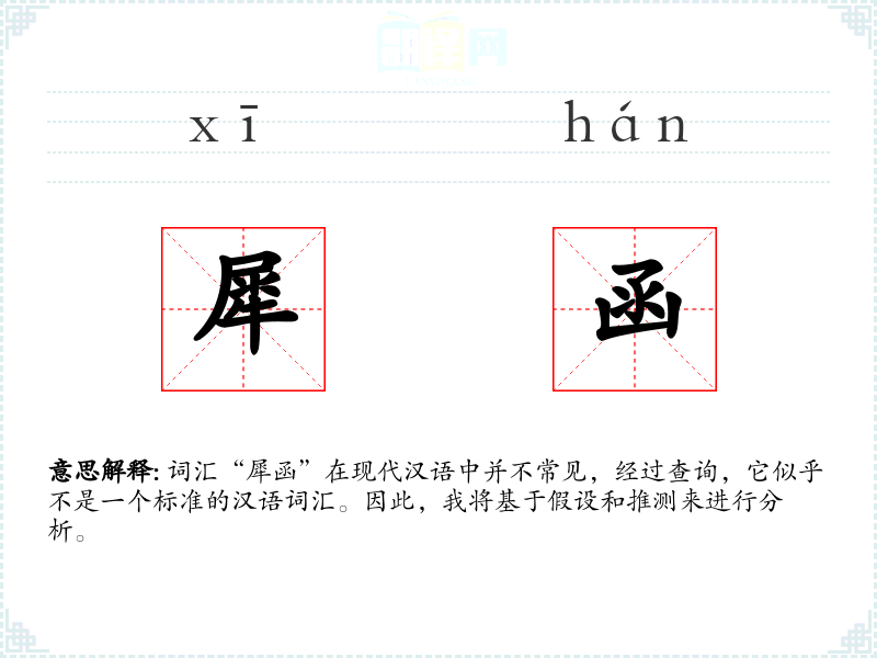 词汇“犀函”在现代汉语中并不常见,经过查询,它似乎不是一个标准的汉语词汇。因此,我将基于假设和推测来进行分析。