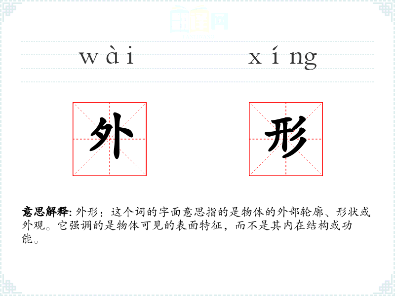 外形:这个词的字面意思指的是物体的外部轮廓、形状或外观。它强调的是物体可见的表面特征,而不是其内在结构或功能。