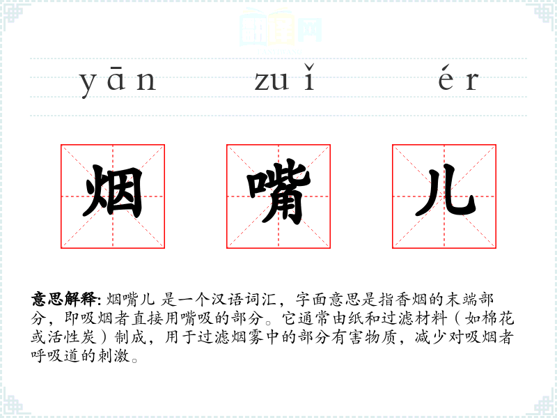 烟嘴儿 是一个汉语词汇,字面意思是指香烟的末端部分,即吸烟者直接用嘴吸的部分。它通常由纸和过滤材料(如棉花或活性炭)制成,用于过滤烟雾中的部分有害物质,减少对吸烟者呼吸道的刺激。