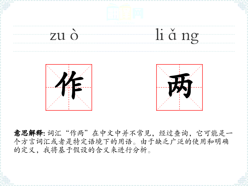 词汇“作两”在中文中并不常见,经过查询,它可能是一个方言词汇或者是特定语境下的用语。由于缺乏广泛的使用和明确的定义,我将基于假设的含义来进行分析。