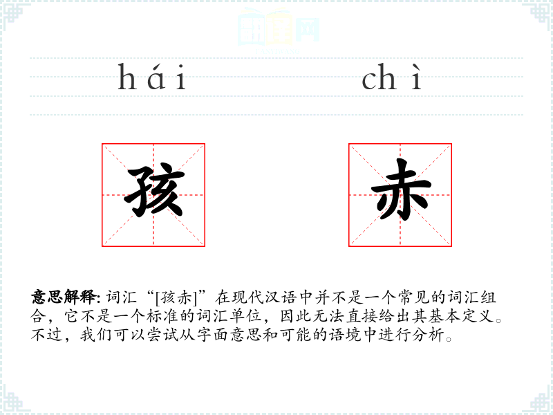 词汇“[孩赤]”在现代汉语中并不是一个常见的词汇组合,它不是一个标准的词汇单位,因此无法直接给出其基本定义。不过,我们可以尝试从字面意思和可能的语境中进行分析。
