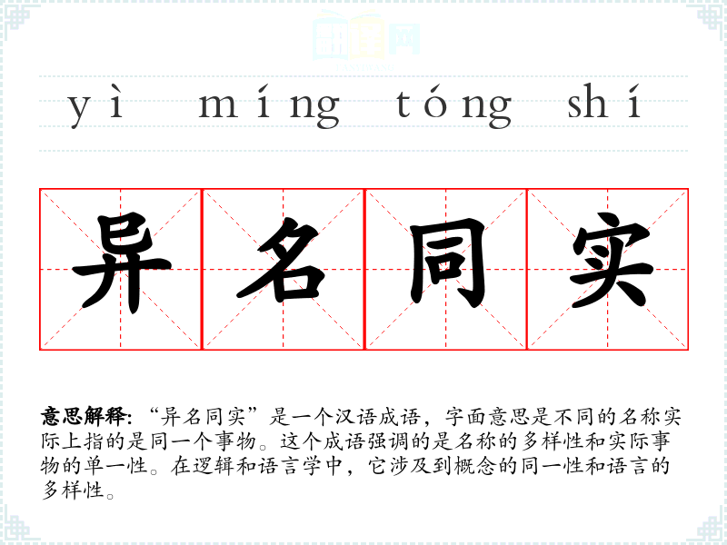 “异名同实”是一个汉语成语,字面意思是不同的名称实际上指的是同一个事物。这个成语强调的是名称的多样性和实际事物的单一性。在逻辑和语言学中,它涉及到概念的同一性和语言的多样性。