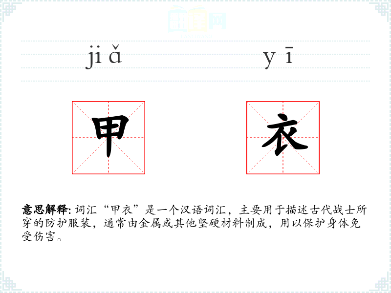 词汇“甲衣”是一个汉语词汇,主要用于描述古代战士所穿的防护服装,通常由金属或其他坚硬材料制成,用以保护身体免受伤害。