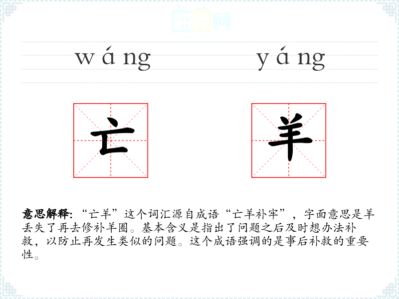 “亡羊”这个词汇在我语言学和表达中是一个重要的成语,它不仅丰富了我的词汇量,也让我在面对问题时更加积极主动。通过深入学和分析,我更加理解了这个成语的深层含义和文化价值。