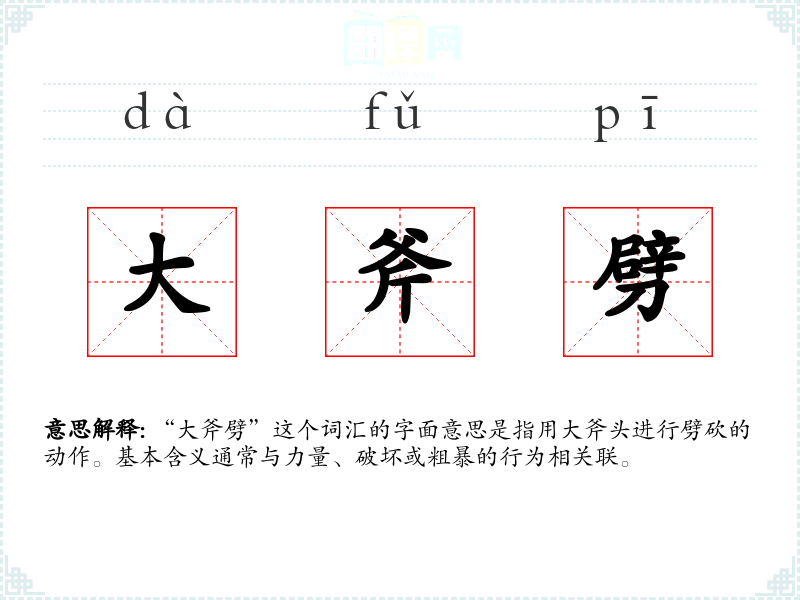 “大斧劈”这个词汇的字面意思是指用大斧头进行劈砍的动作。基本含义通常与力量、破坏或粗暴的行为相关联。