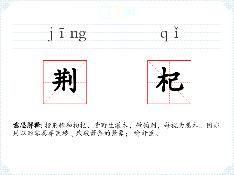 指荆棘和枸杞,皆野生灌木,带钩刺,每视为恶木。因亦用以形容蓁莽荒秽﹑残破萧条的景象; 喻奸臣。