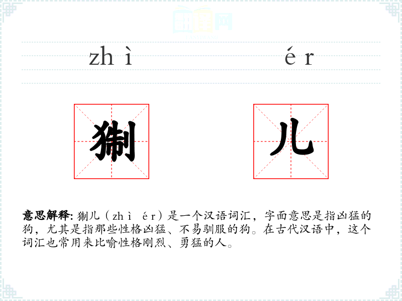 猘儿(zhì ér)是一个汉语词汇,字面意思是指凶猛的狗,尤其是指那些性格凶猛、不易驯服的狗。在古代汉语中,这个词汇也常用来比喻性格刚烈、勇猛的人。