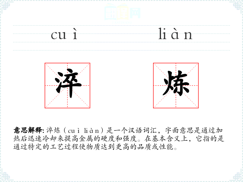 淬炼(cuì liàn)是一个汉语词汇,字面意思是通过加热后迅速冷却来提高金属的硬度和强度。在基本含义上,它指的是通过特定的工艺过程使物质达到更高的品质或性能。
