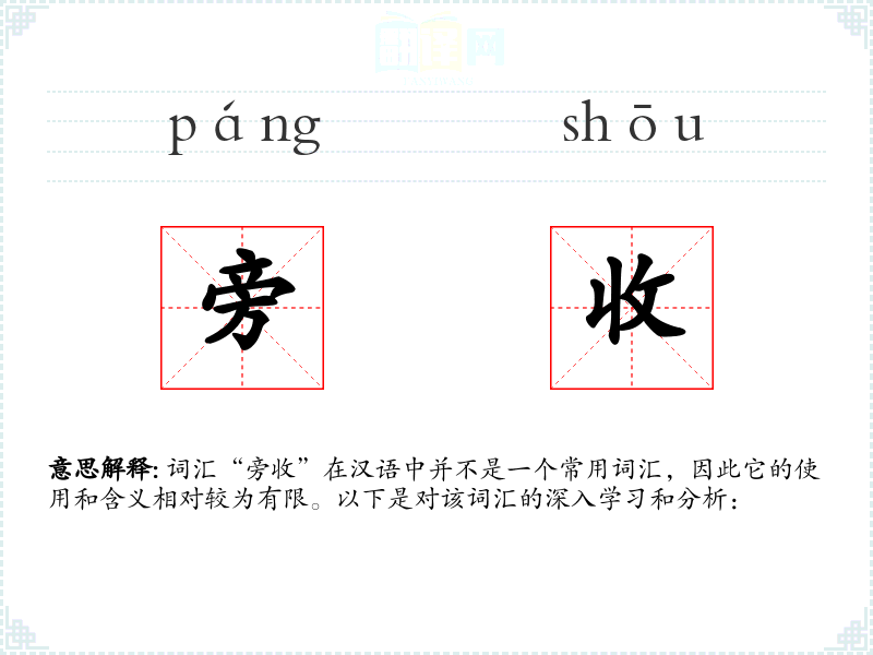 词汇“旁收”在汉语中并不是一个常用词汇,因此它的使用和含义相对较为有限。以下是对该词汇的深入学习和分析: