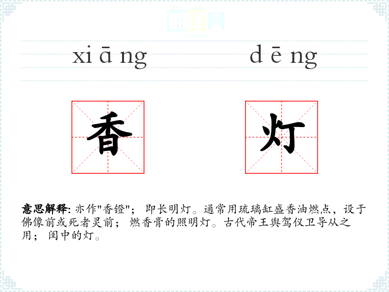 亦作"香镫"; 即长明灯。通常用琉璃缸盛香油燃点,设于佛像前或死者灵前; 燃香膏的照明灯。古代帝王舆驾仪卫导从之用; 闺中的灯。