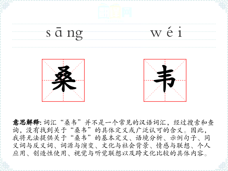 词汇“桑韦”并不是一个常见的汉语词汇,经过搜索和查询,没有找到关于“桑韦”的具体定义或广泛认可的含义。因此,我将无法提供关于“桑韦”的基本定义、语境分析、示例句子、同义词与反义词、词源与演变、文化与社会背景、情感与联想、个人应用、创造性使用、视觉与听觉联想以及跨文化比较的具体内容。