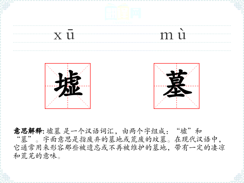 墟墓 是一个汉语词汇,由两个字组成:“墟”和“墓”。字面意思是指废弃的墓地或荒废的坟墓。在现代汉语中,它通常用来形容那些被遗忘或不再被维护的墓地,带有一定的凄凉和荒芜的意味。