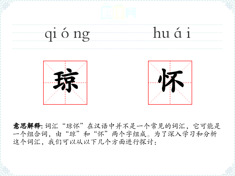 词汇“琼怀”在汉语中并不是一个常见的词汇,它可能是一个组合词,由“琼”和“怀”两个字组成。为了深入学习和分析这个词汇,我们可以从以下几个方面进行探讨: