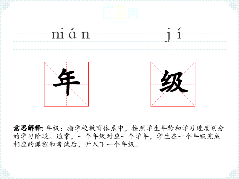 - 词源:年级一词源于汉语,古汉语中已有“年级”一词,意指学习的阶段。