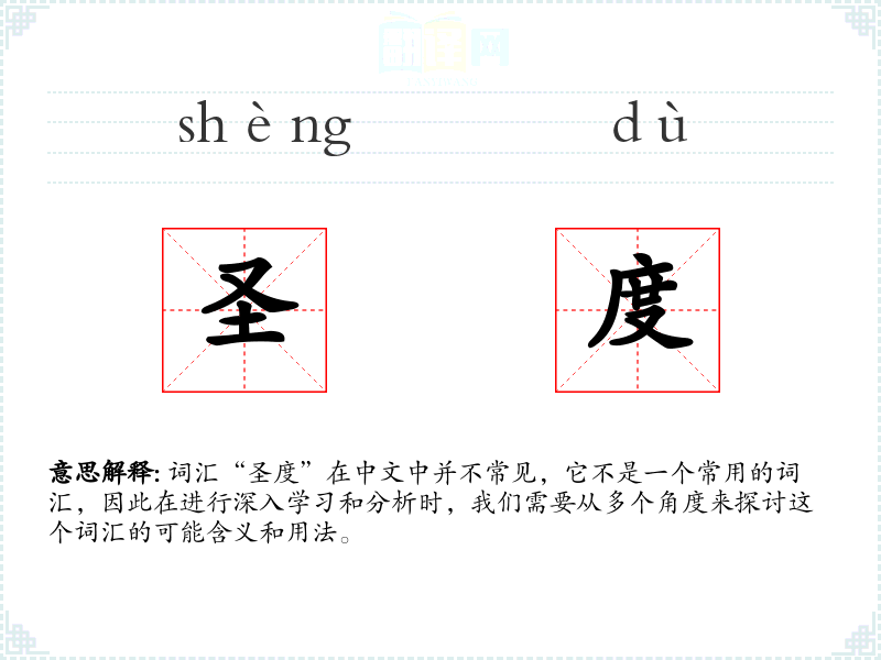 由于“圣度”不是一个常用词汇,其词源和演变可能不太明确。它可能是由“圣”和“度”两个字组合而成,其中“圣”指的是神圣的,而“度”则有度量、程度的含义。