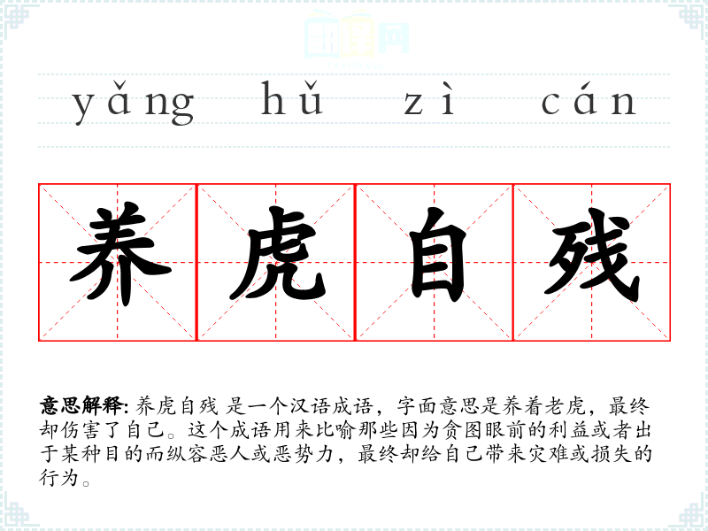 养虎自残 是一个汉语成语,字面意思是养着**,最终却伤害了自己。这个成语用来比喻那些因为贪图眼前的利益或者出于某种目的而纵容恶人或恶势力,最终却给自己带来灾难或损失的行为。