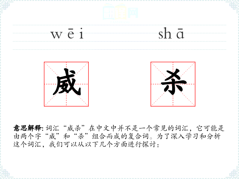 词汇“威杀”在中文中并不是一个常见的词汇,它可能是由两个字“威”和“杀”组合而成的复合词。为了深入学*和分析这个词汇,我们可以从以下几个方面进行探讨: