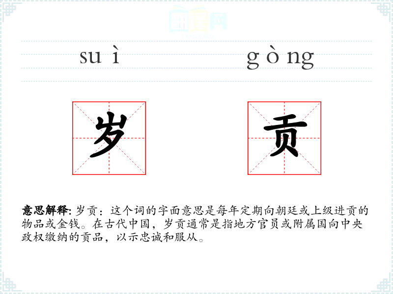 岁贡:这个词的字面意思是每年定期向朝廷或上级进贡的物品或金钱。在古代**,岁贡通常是指地方官员或附属国向中央政权缴纳的贡品,以示忠诚和服从。