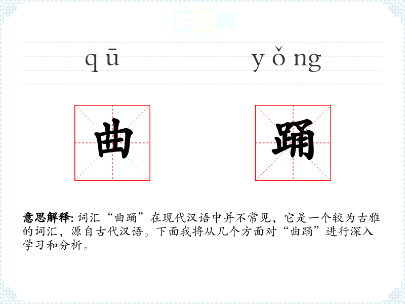 词汇“曲踊”在现代汉语中并不常见,它是一个较为古雅的词汇,源自古代汉语。下面我将从几个方面对“曲踊”进行深入学*和分析。