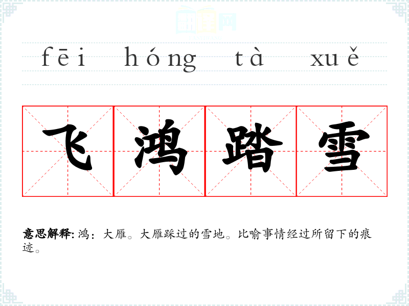 鸿:大雁。大雁踩过的雪地。比喻事情经过所留下的痕迹。