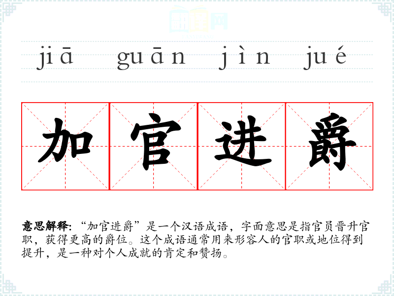 “加官进爵”是一个汉语成语,字面意思是指官员晋升官职,获得更高的爵位。这个成语通常用来形容人的官职或地位得到提升,是一种对个人成就的肯定和赞扬。