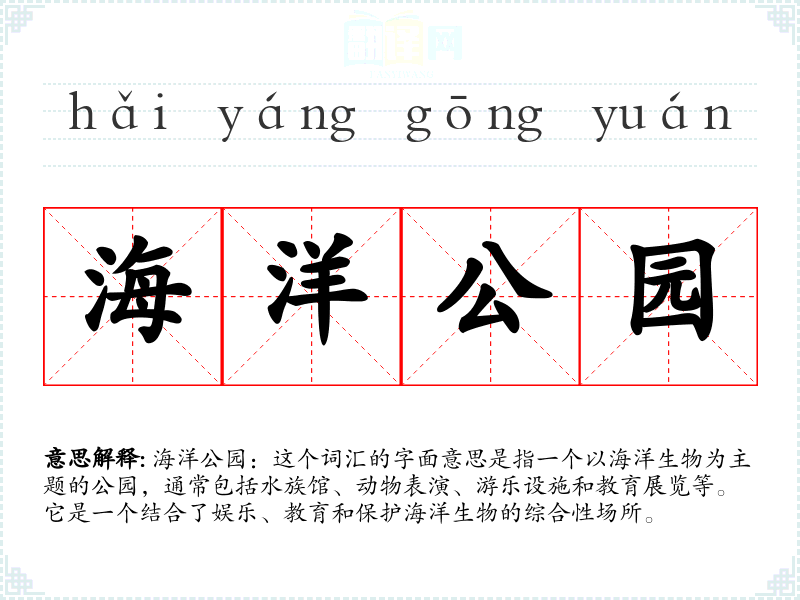 海洋公园:这个词汇的字面意思是指一个以海洋生物为主题的公园,通常包括水族馆、动物表演、游乐设施和教育展览等。它是一个结合了娱乐、教育和保护海洋生物的综合性场所。