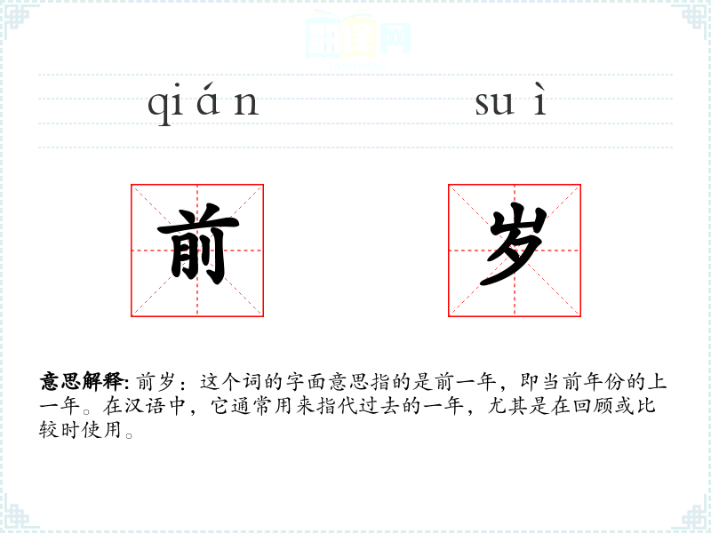 “前岁”一词在汉语中有着悠久的历史,其字面组合“前”和“岁”分别表示“之前”和“年”,合起来即指前一年。在古代文献中,这个词就已经被广泛使用,至今其基本含义和用法几乎没有变化。