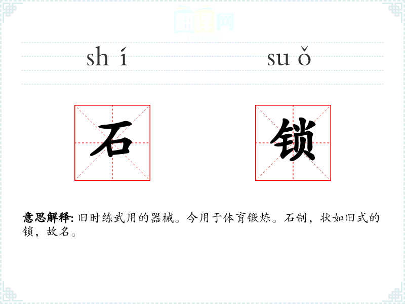 旧时练武用的器械。今用于体育锻炼。石制,状如旧式的锁,故名。