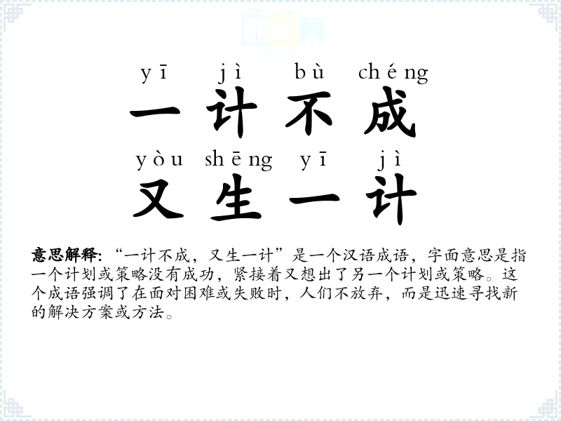 “一计不成,又生一计”是一个汉语成语,字面意思是指一个计划或策略没有成功,紧接着又想出了另一个计划或策略。这个成语强调了在面对困难或失败时,人们不放弃,而是迅速寻找新的解决方案或方法。