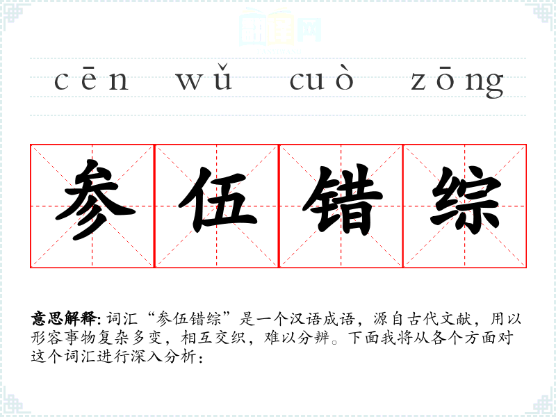 词汇“参伍错综”是一个汉语成语,源自古代文献,用以形容事物复杂多变,相互交织,难以分辨。下面我将从各个方面对这个词汇进行深入分析: