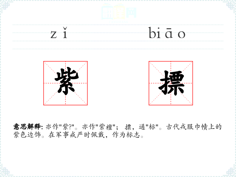 亦作"紫?"。亦作"紫襢"; 摽,通"标"。古代戎服巾帻上的紫色边饰。在军事戒严时佩戴,作为标志。