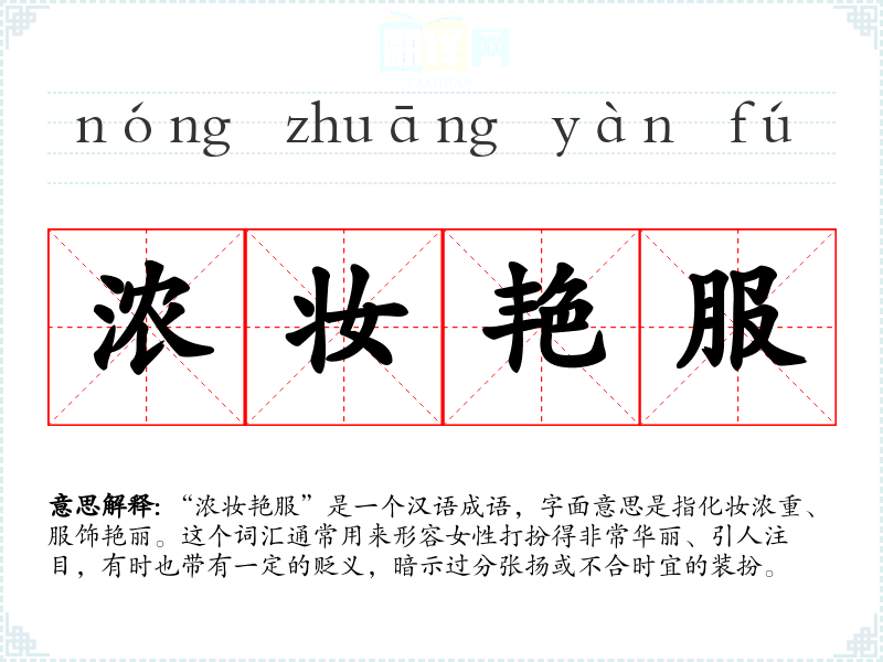 “浓妆艳服”是一个汉语成语,字面意思是指化妆浓重、服饰艳丽。这个词汇通常用来形容女性打扮得非常华丽、引人注目,有时也带有一定的贬义,暗示过分张扬或不合时宜的装扮。
