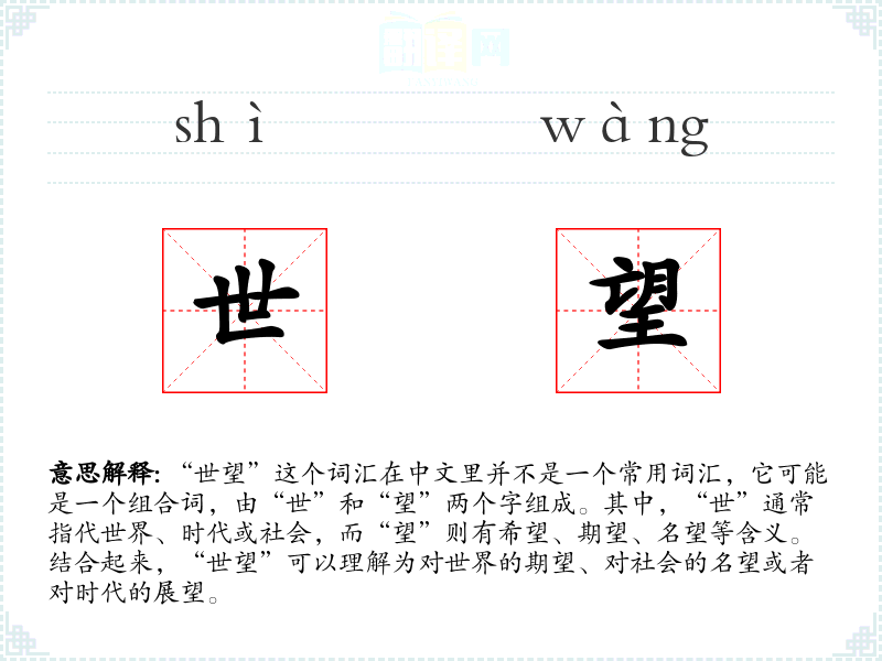 在特定的文化或社会背景中,“世望”可能被用来强调对未来的积极态度或对某个社会群体的尊重和敬仰。例如,在讨论社会发展或家族荣誉时,可能会用到这个词汇。