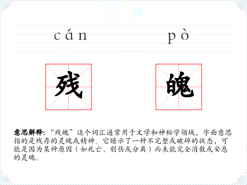 “残魄”这个词汇的词源可能来源于古代对灵魂和死亡的观念。在古代文化中,人们相信灵魂在死后可能不会立即消散,而是以某种形式存在。随着时间的推移,这个词汇被用于描述那些未能完全安息的灵魂。