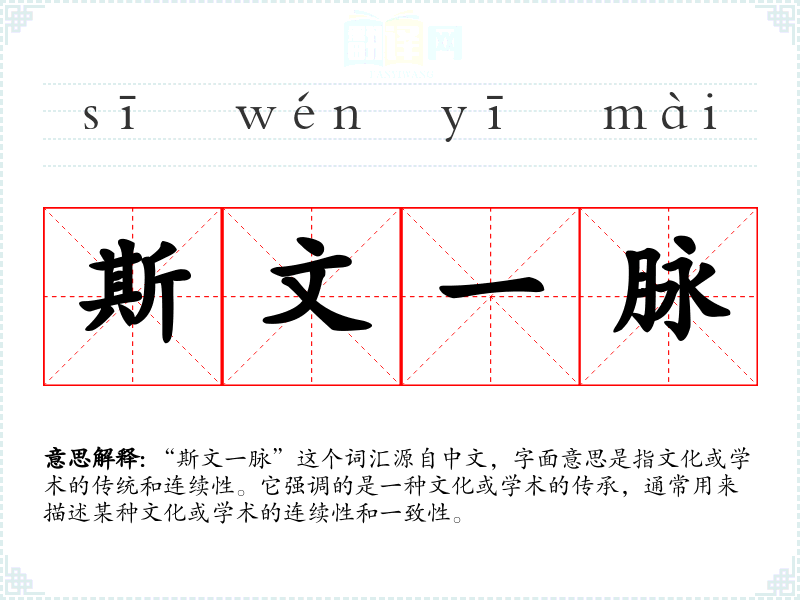 “斯文一脉”这个词汇源自中文,字面意思是指文化或学术的传统和连续性。它强调的是一种文化或学术的传承,通常用来描述某种文化或学术的连续性和一致性。