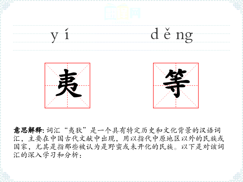 - 反义词:华夏、中原、诸夏等,这些词汇指代中原地区的民族,与“夷狄”形成对比。