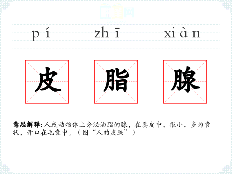 人或动物体上分泌油脂的腺,在真皮中,很小,多为囊状,开口在毛囊中。(图“人的皮肤”)