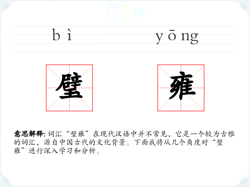 “璧雍”一词由两个字组成:“璧”和“雍”。璧,古代一种扁平、圆形、中间有孔的玉器,常用于礼器或作为贵族的象征;雍,有和谐、和睦之意。因此,“璧雍”可以理解为象征和谐、美好的玉器,或者引申为和谐、美好的状态。
