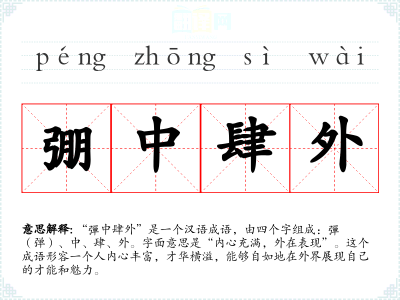 “彈中肆外”是一个汉语成语,由四个字组成:彈(弹)、中、肆、外。字面意思是“内心充满,外在表现”。这个成语形容一个人内心丰富,才华横溢,能够自如地在外界展现自己的才能和魅力。