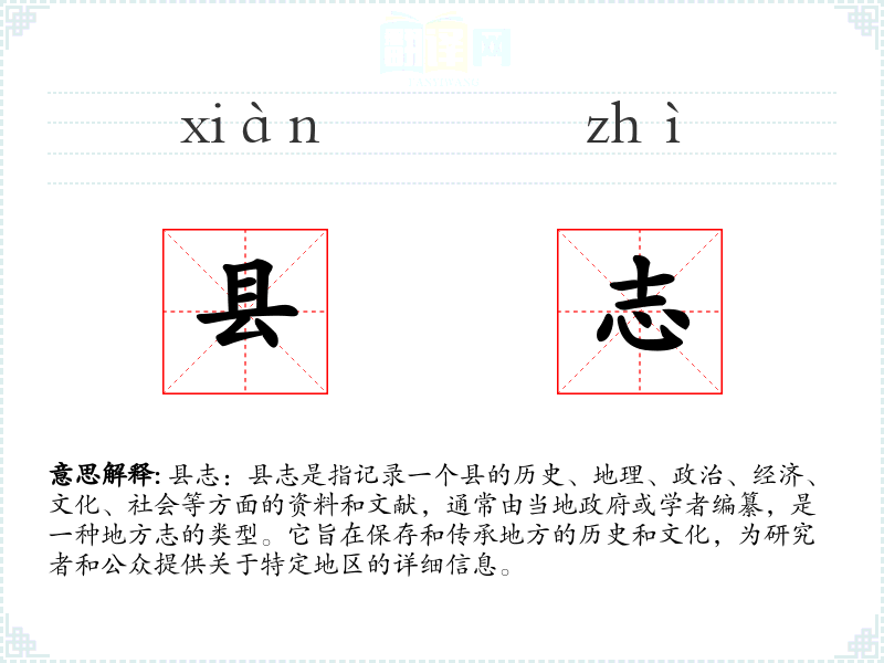 县志:县志是指记录一个县的历史、地理、政治、经济、文化、社会等方面的资料和文献,通常由当地政府或学者编纂,是一种地方志的类型。它旨在保存和传承地方的历史和文化,为研究者和公众提供关于特定地区的详细信息。