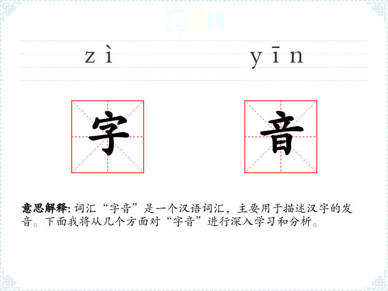 “字音”指的是汉字的声音,即汉字在语言中的发音。每个汉字通常有一个或多个标准的发音,这些发音在普通话中通常基于汉语拼音系统来表示。