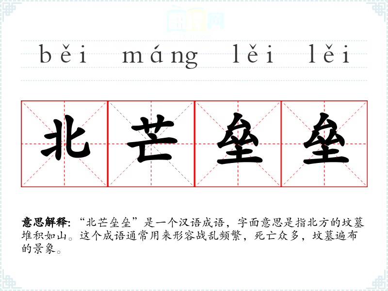 “北芒垒垒”是一个汉语成语,字面意思是指北方的坟墓堆积如山。这个成语通常用来形容战乱频繁,死亡众多,坟墓遍布的景象。