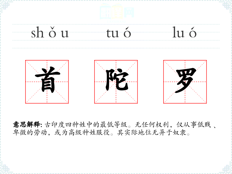 古印度四种姓中的最低等级。无任何权利,仅从事低贱﹑卑微的劳动,或为高级种姓服役。其实际地位无异于奴隶。