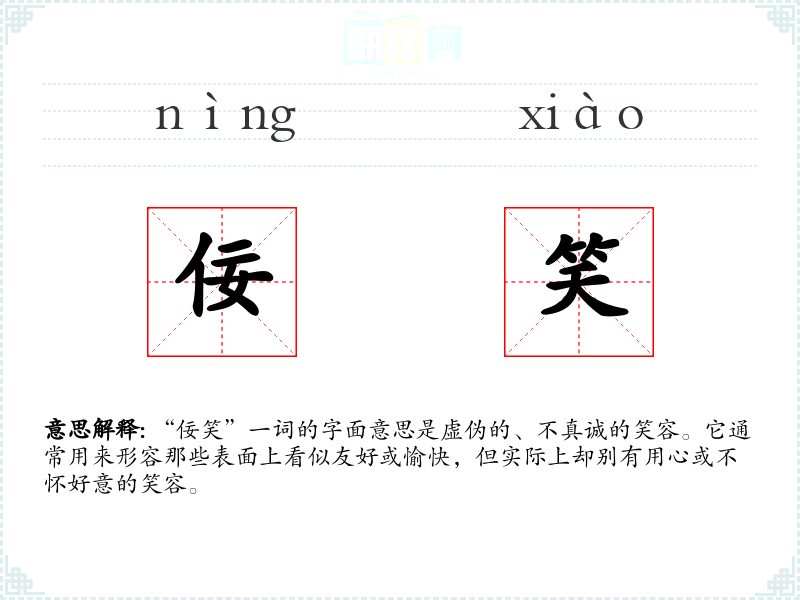 “佞笑”一词的字面意思是虚伪的、不真诚的笑容。它通常用来形容那些表面上看似友好或愉快,但实际上却别有用心或不怀好意的笑容。