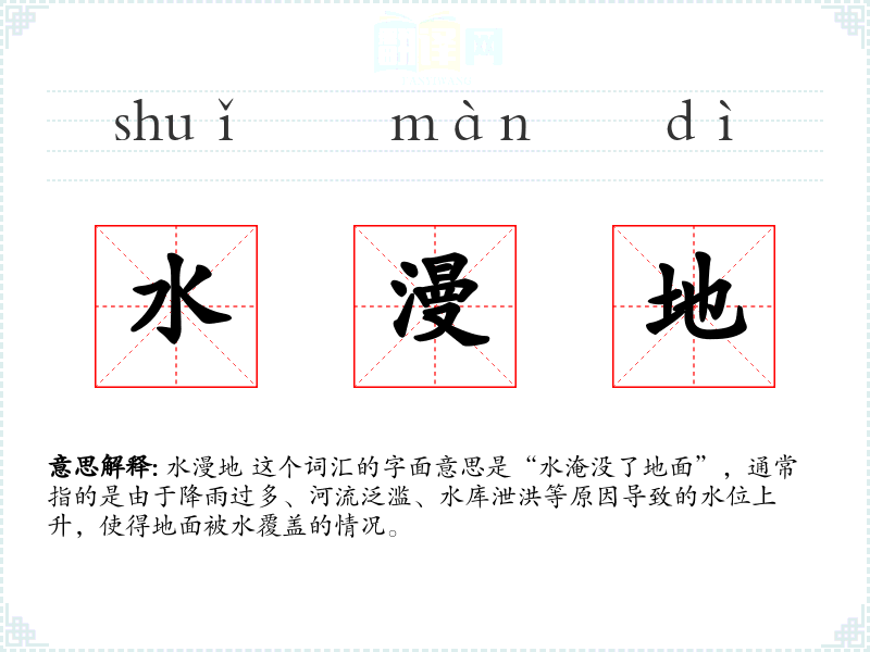 水漫地 这个词汇的字面意思是“水淹没了地面”,通常指的是由于降雨过多、河流泛滥、水库泄洪等原因导致的水位上升,使得地面被水覆盖的情况。