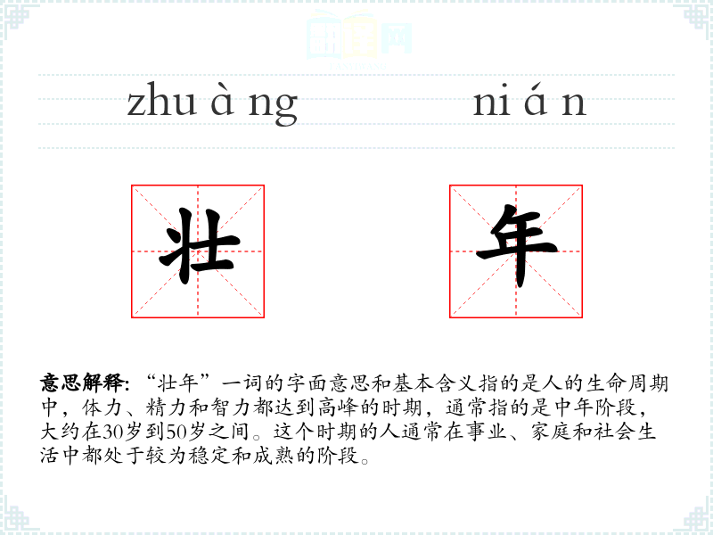 “壮年”一词的字面意思和基本含义指的是人的生命周期中,体力、精力和智力都达到高峰的时期,通常指的是中年阶段,大约在30岁到50岁之间。这个时期的人通常在事业、家庭和社会生活中都处于较为稳定和成熟的阶段。