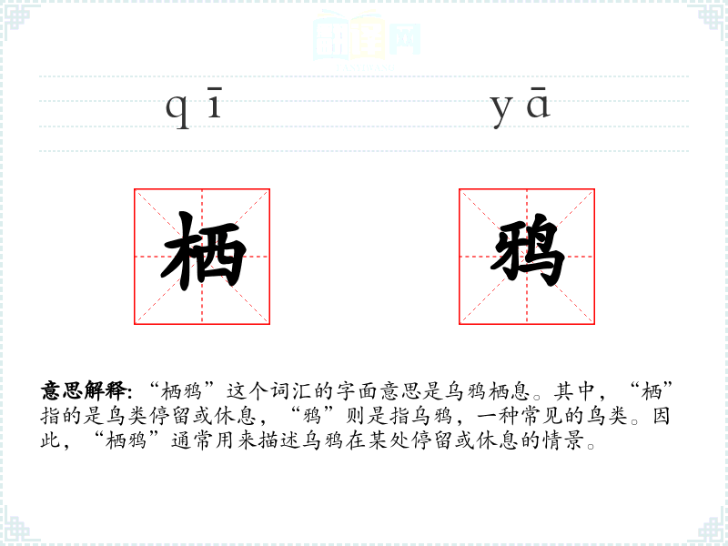 “栖鸦”这个词汇的字面意思是乌鸦栖息。其中,“栖”指的是鸟类停留或休息,“鸦”则是指乌鸦,一种常见的鸟类。因此,“栖鸦”通常用来描述乌鸦在某处停留或休息的情景。